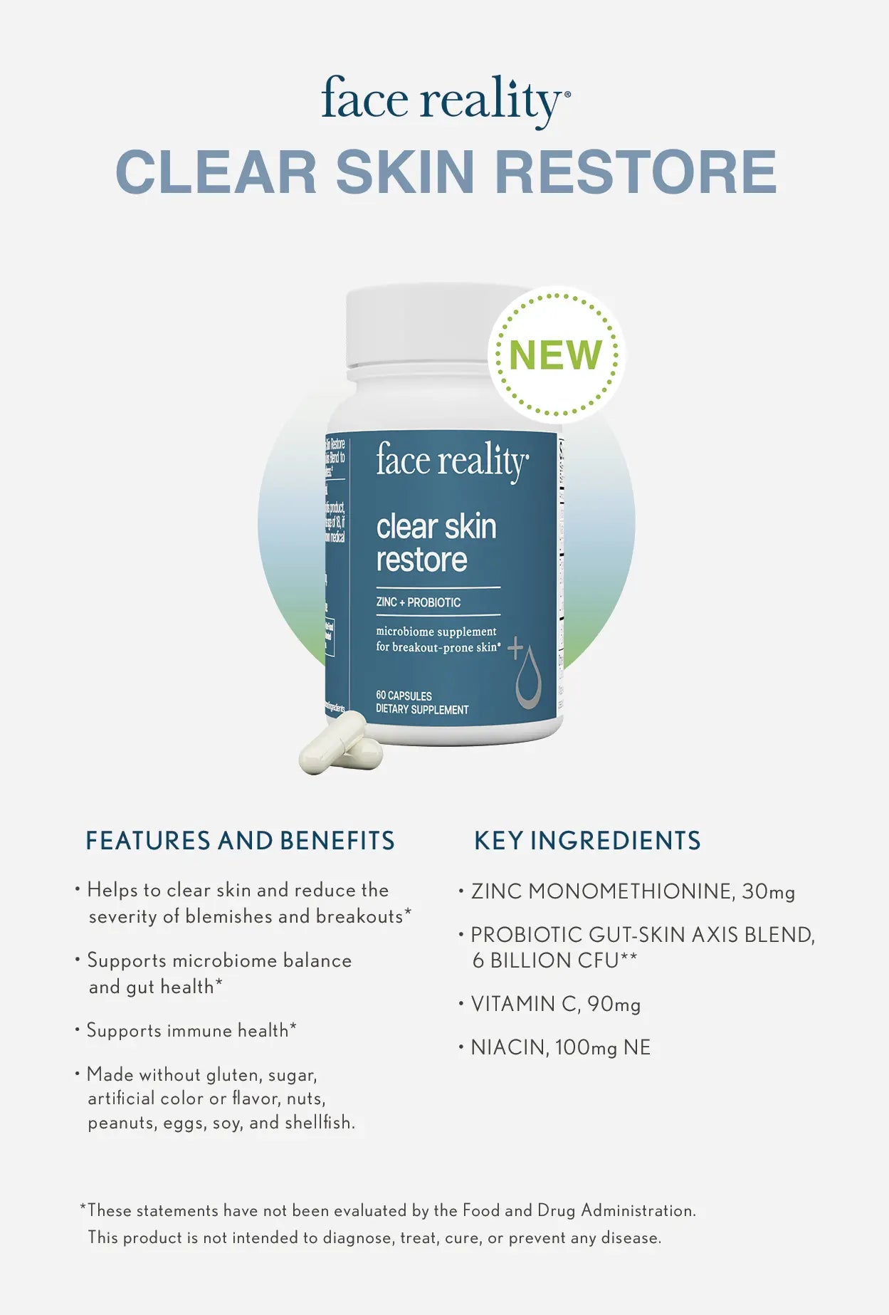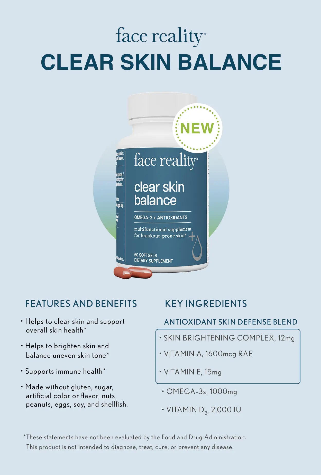 Face Reality Clear Skin Balance is a daily supplement formulated to support acne-prone skin from the inside out. This targeted blend of essential nutrients helps address the root causes of breakouts—such as inflammation, excess oil, and a weakened skin barrier—while also strengthening overall skin health.