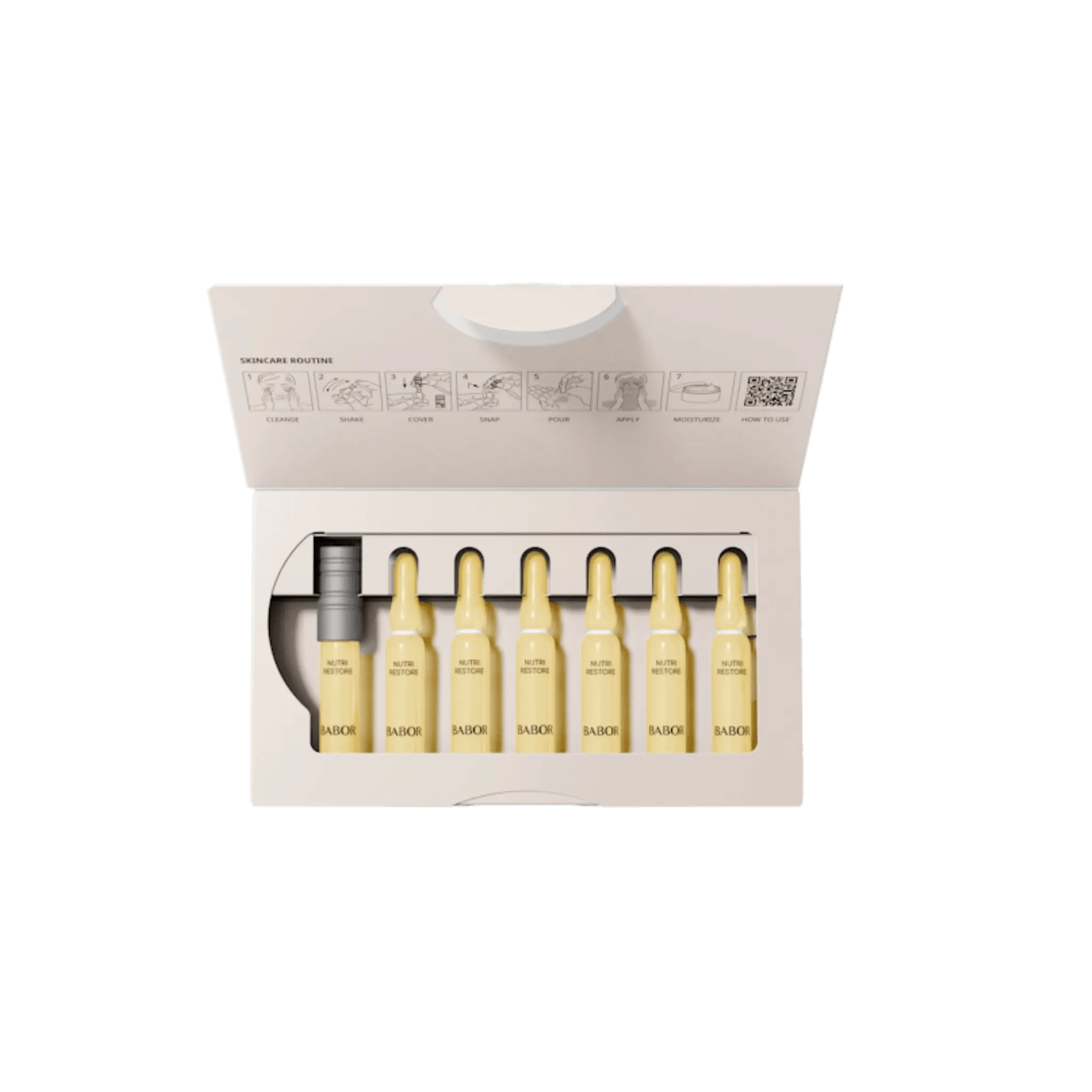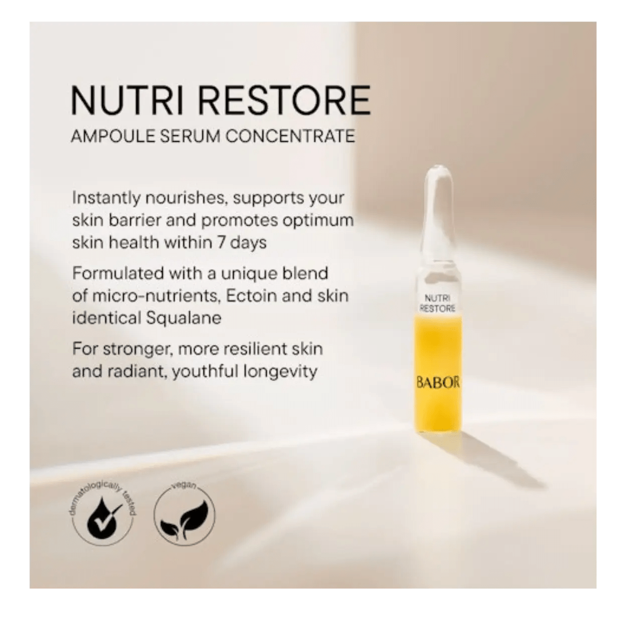Daily stress and environmental factors can leave the skin looking dull and tired. The Nutri Restore Ampoule features a micronutrient-rich formula, infused with Aloe Vera and enriched with 19 amino acids, proteins, minerals, electrolytes, lipids, and vitamins to provide hydration and improve the appearance of the skin. Ectoin helps maintain the skin's natural barrier, while Argan oil and Squalane deliver moisture for a smooth, radiant-looking complexion. Skin feels refreshed, nourished, and visibly revitalized.